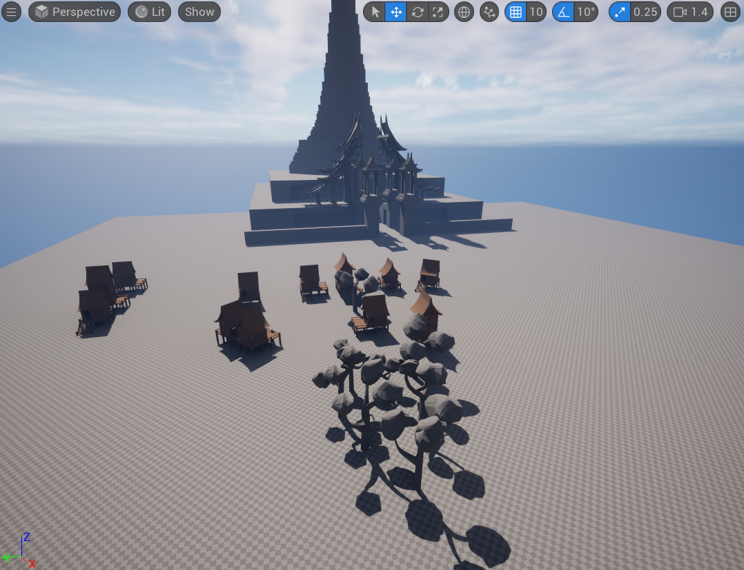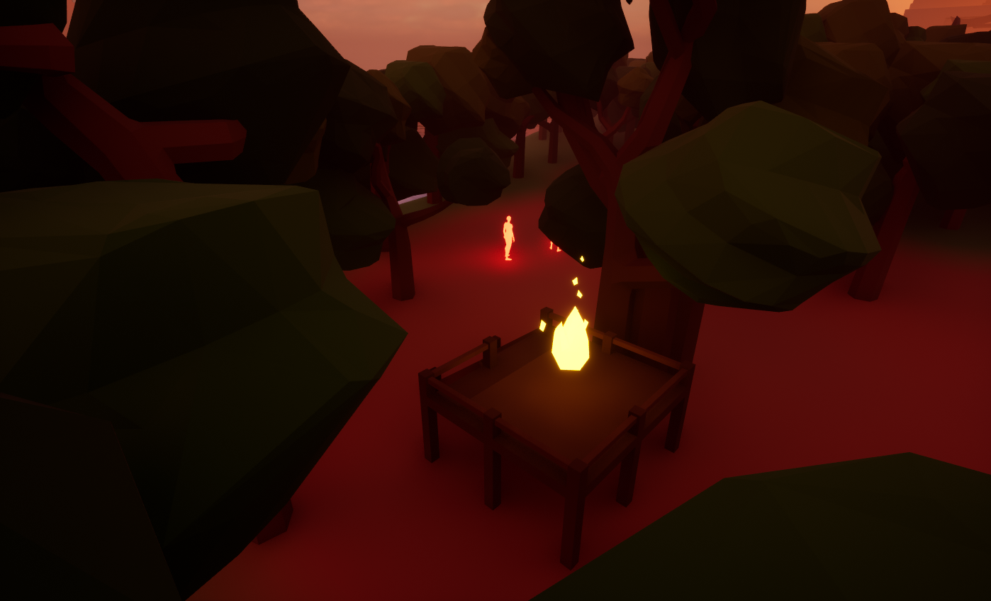 I adjusted the small cluster of trees to block the playerβs view of the temple and added a test βsanctuaryβ (a player safe point) beneath them. The sanctuary features a glow effect that immediately draws the playerβs attention. This placement not only guides player movement but also encourages them to interact with the safe point early in the game.